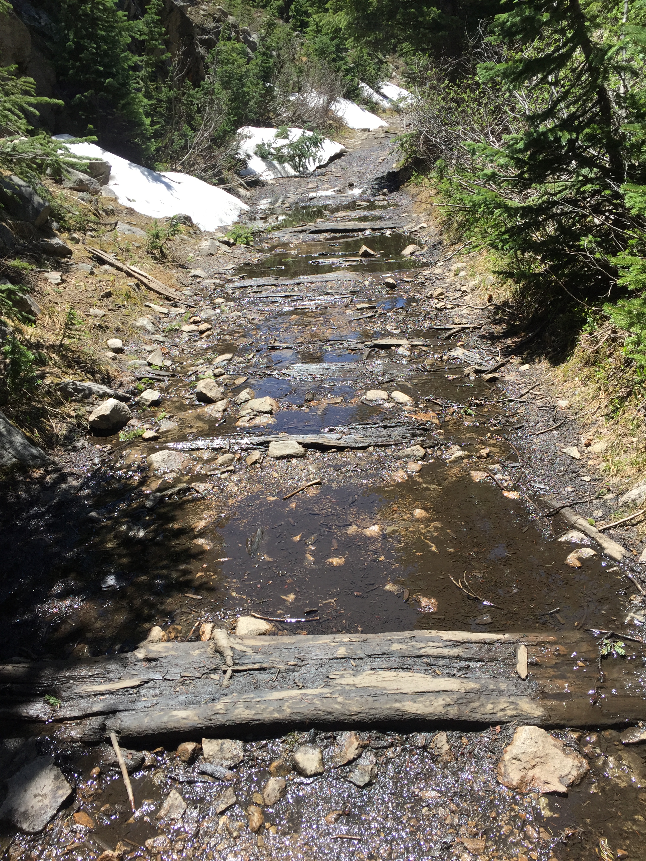 6/24 Party Saver passed my tent last evening and I talked with him briefly this morning. We were all going to take the Mirror Lake alternate since it was supposed to have less snow and run a little lower than the “official” CDT. What a day. 2.5 miles of blowdown and snow patches, then a long trudge up Tincup Pass Road to where it was blocked by snow, then a short, sketchy snow field, very steep, where I used my micro spikes to step very carefully in the footprints ahead of me. I went over the top and down the road, looking more like a river of rocks and water than a road, to Mirror Lake. The maps all showed the road going around the lake. Not so. The road was mostly underwater, so I waded on the flat roadbed below thigh deep lake for maybe a 1/4 mile, while people on the other side watched from their beach chairs. It was a lot easier than trying to keep my feet dry by scrambling through willows on the steep hillside. Then up an ATV trail, straight up, around a cornice at the “high point” noted on the map, and down beautiful double track, until it wasn’t. Up again and down to Cow Creek where AJ and Dassie pitched their tent nearby. Yay, company! It was a great day really, gorgeous, exhausting. My ankle looks like shit, but it works.