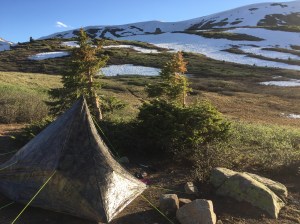 6/23 I had a great campsite at the north end of Boss Lake, tough to sleep though because of the altitude. The first part of the day was down through trees and then up through a pass. I am very, very slow so I have to adjust my expectations and embrace my limitations. Solo helps! Nobody to keep up with, nobody waiting on me. There are really spectacularly beautiful cirques, the snowfields aren’t too bad, the snow itself is consolidated and shallow and there hasn’t been anything too scary or treacherous. So of course I tripped on some brush on a flat stretch, rolled my ankle, yelled obscenities at the top of my voice, and laid on the ground till the pain subsided and I could do a self assessment. Just the usual–it will swell and stiffen but I can limp along. I hobbled slowly over the next 2 passes, and camped in a slightly sheltered spot behind trees and views that make my heart sing. If the ankle isn’t useable tomorrow, I can retreat 7-8 miles back to a trailhead that had a bunch of cars and day hikers.