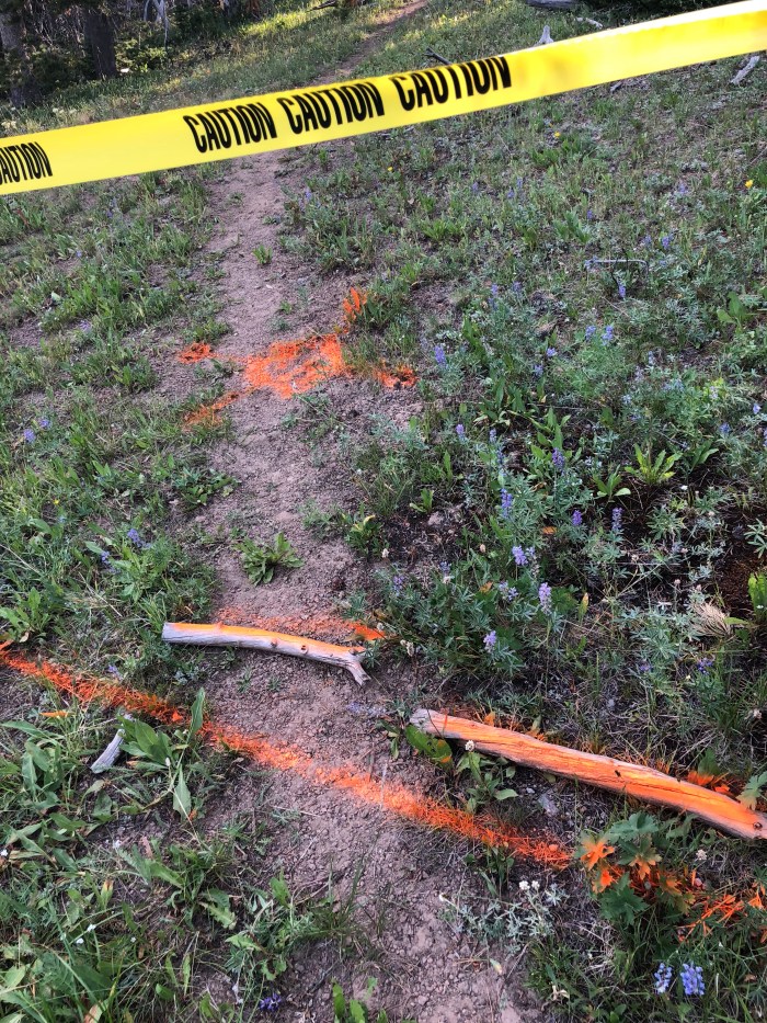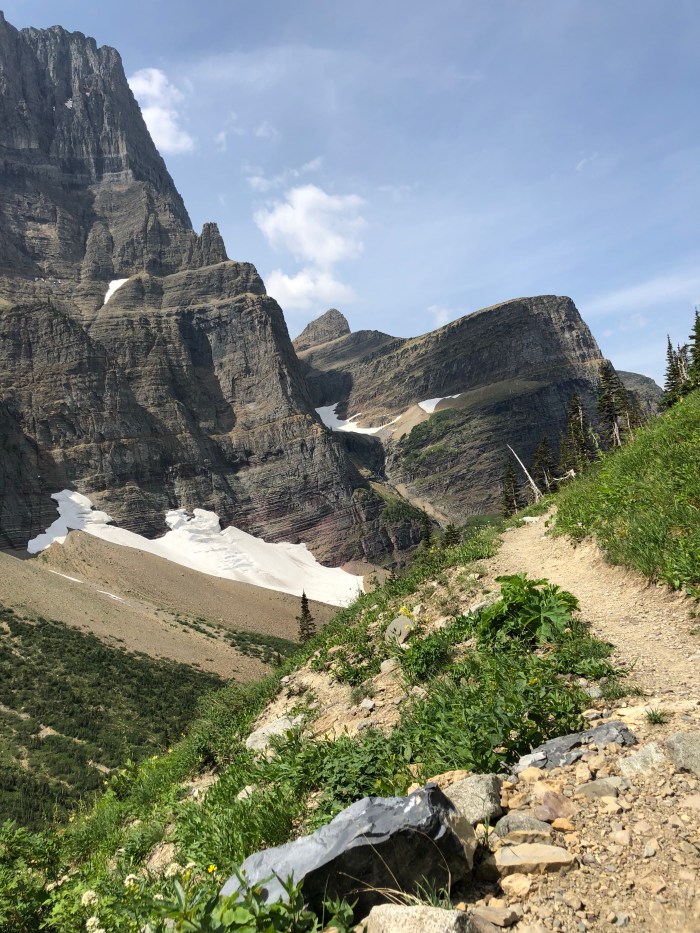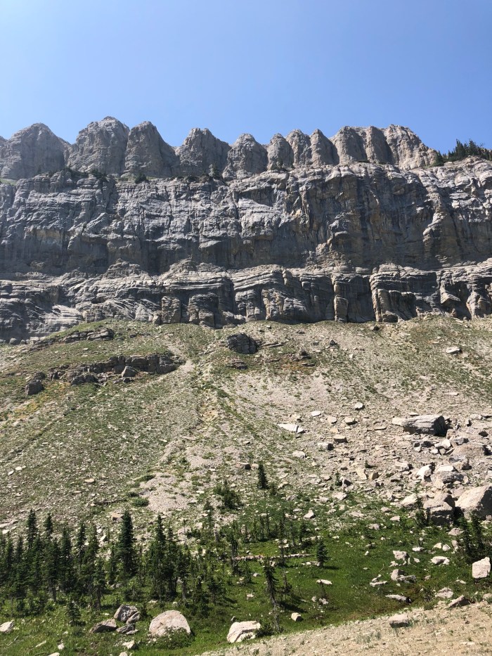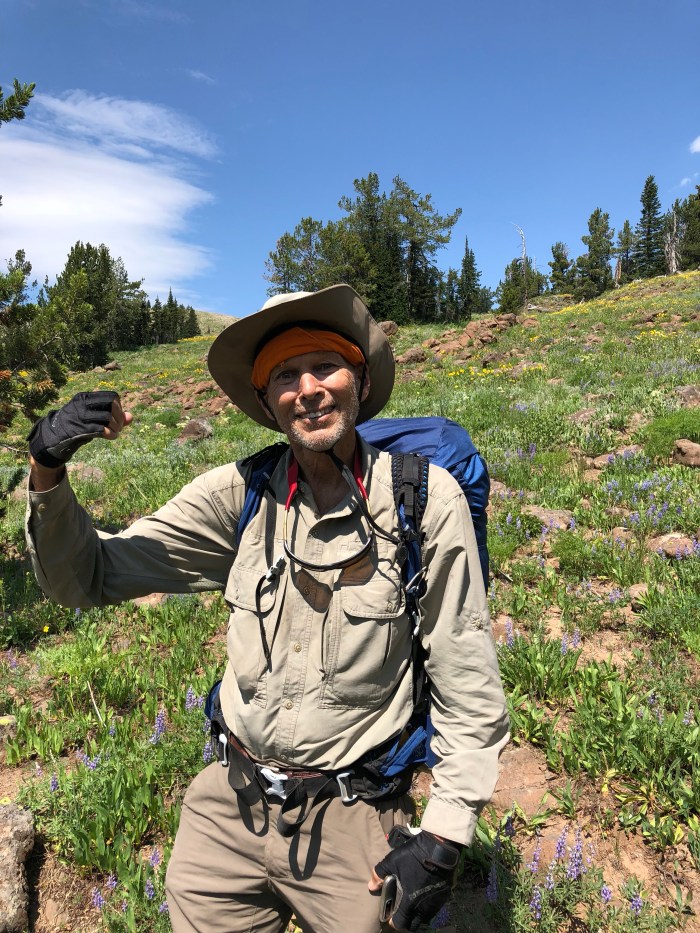 I made it off the Spotted Bear onto the CDT and saw lots of horses going to “The Wall” a beautiful cliff formation. I camped near a creek and about 8 pm, NOBO Flower-Man (“Flower Man,” he always says, turning slightly to show the bouquet of fake flowers stuck in his pack’s back pocket) stopped to chat. I met him near Togwotee Pass in Wyoming.