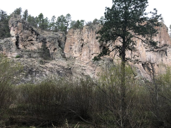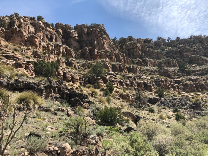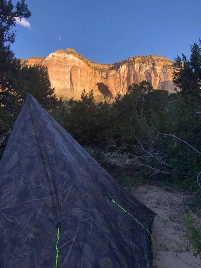 Probably not supposed to camp where I camped, stealthily, near La Ventana Arch. It gets weird on the highway, I think I’m on public land, National Forest, but there’s barbed wire fence just outside the right-of-way that’s hard to get over or under, so when I came to the turnout for the Arch, I dashed uphill out of sight. Just a few cars went by on the highway during the night and I was comfortable. Hiking is kind of weird sometimes, not what you’d expect of a “wilderness experience.” Hah! I camped on sand and left no trace.