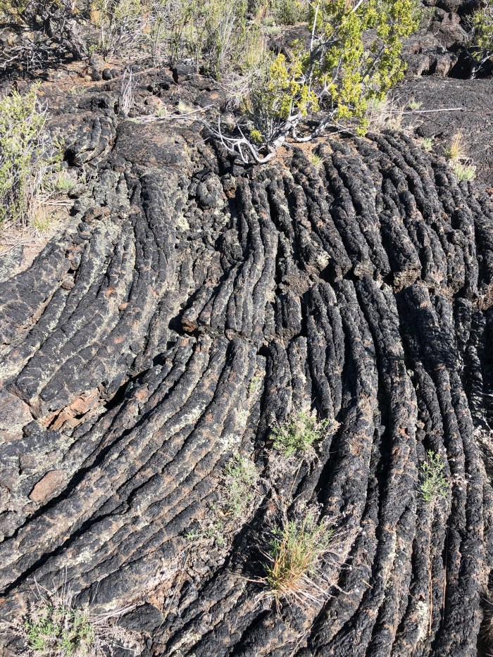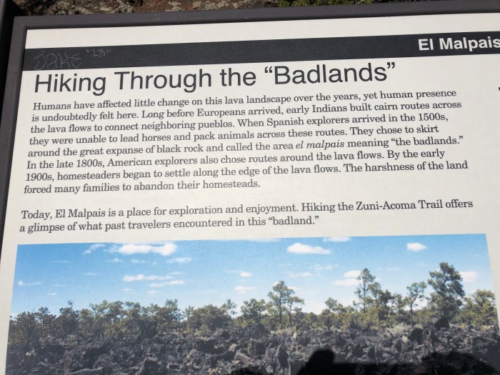 Zuni-Acoma trailhead to Bonita-Zuni alternate. What a mixed day! Paved highway to El Malpais (the Badlands). Two years ago, the Ravens and I stayed on the official CDT (Highway 117) all the way to Grants. This time I wanted to walk the 7 mile Zuni- Acoma trail through decaying lava fields. I’ve lived on the Big Island of Hawaii and know the beauty and torture of new pahoehoe and a’a’ and have walked through the obsidian fields on the Oregon PCT. There’s not really a trail, you follow a route cairn to cairn. Hard work for ankles but a unique experience I’ve looked forward to.