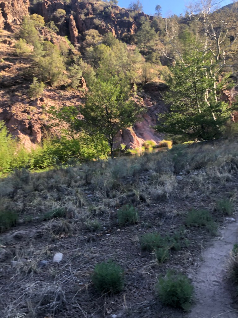 After an uncomfortable, hot night in the motel, we hit the road at 7. Those guys did the Gila Cliff Dwellings, which I’ve seen and loved. I told them to take the beautiful Little Bear Canyon route after leaving the Cliff Dwellings. I hiked alone all day, through the Gila. I love this place, this trail. I saw 11 hikers going south, short haulers and Strange Bird who was hiking out on a broken foot. I told him Tinman was behind but could help confirm the injury. Later I heard from another hiker that I had helped Strange Bird by listening and affirming. He told me a lot about himself—high functioning, 54, high pain threshold, other personal details—and I’m glad I made him feel like he was making the right decision by patiently (45 minutes standing in the trail) listening. I love that the trail makes me be a better person.